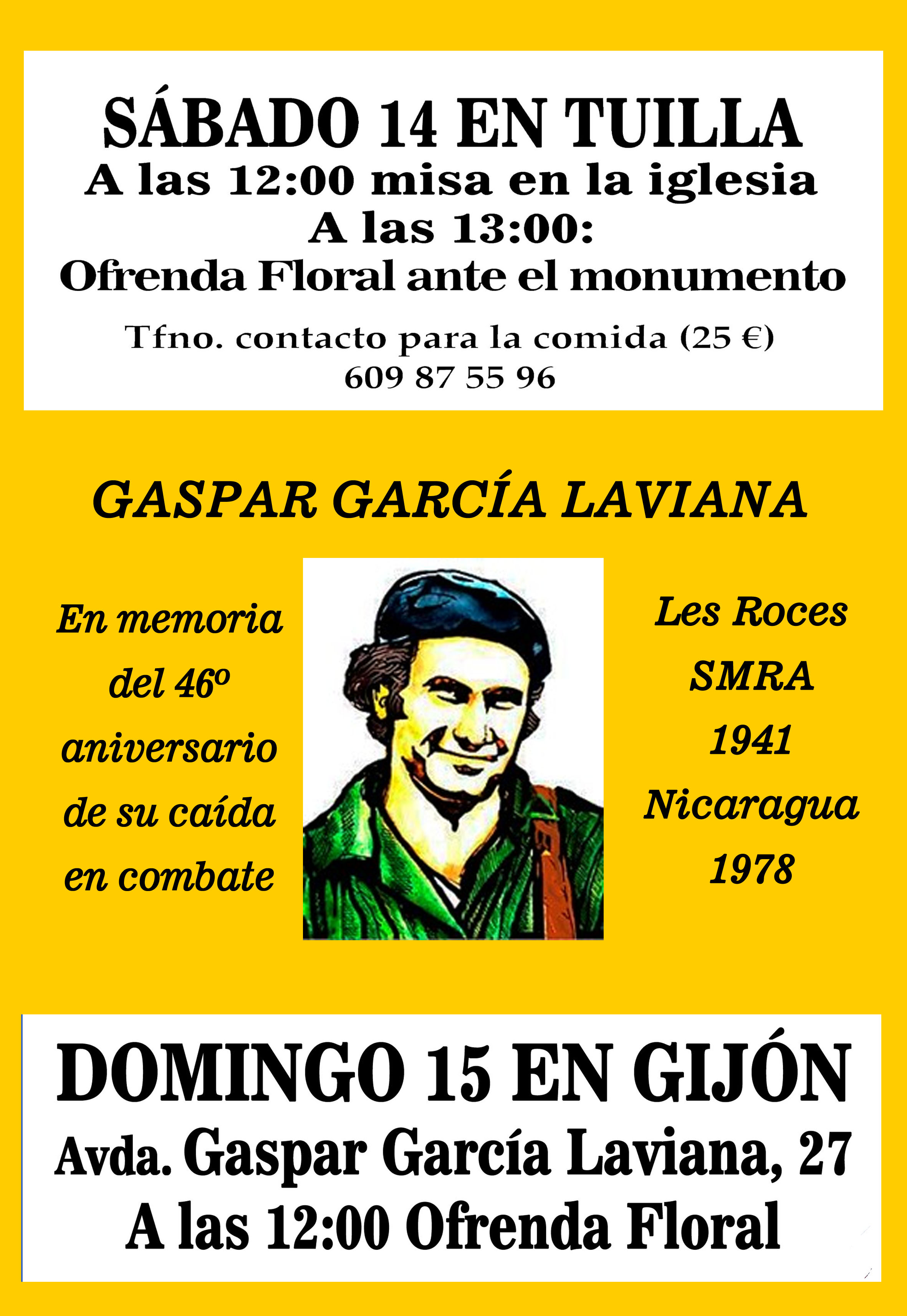 En estos momentos nos coordinamos para preparar los actos de ambos días la Asociación Asturiana Gaspar García Laviana, El Foro de Cristianos GGL, COSAL, Soldepaz-Pachakuti y la Asociación Por la Memoria de GGL. También estas asociaciones asisten e invitan a sus miembros y demás a participar en ambos lugar para mantener viva la memoria del misionero guerrillero que perdió su vida luchando por la liberación del pueblo nicaraagüense. Es de justicia recordar su vida y al mismo tiempo, por haber sido ejemplar su comortamiento, nos anima hoy a mantenernos firmes en el quehacer de un mundo mejor: más justo y solidario, que es el mejor camino para que los pueblos vivan en paz.