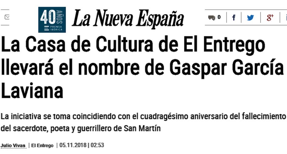 Consideramos también muy importante el hecho de que el Ayuntamiento de San Martín del Rey Aurelio haya dado el pasado 8 de noviembre el nombre de Gaspar García Laviana a la Casa de Cultura de El Entrego, que será siempre un anuncio de la existencia de este personaje nacido en esta parroquia sanmartiniega. Igualmente hay que destacar la Eucaristía y la Ofrenda Floral del 15 de diciembre en Tuilla, actos en los que han participado un importante número de personas.