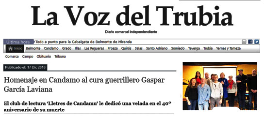 "Esther Martínez/Candamo. El club de lectura ‘Lletres de Candamu’ rindió un homenaje el pasado viernes a Gaspar García Laviana, que fue sacerdote, misionero de la orden del Sagrado Corazón, guerrillero y poeta. El día 13 de diciembre se cumplieron cuarenta años de su muerte en combate en Cárdenas (Nicaragua), cerca de la frontera con Costa Rica, donde luchaba contra la dictadura de Somoza en 1978. Formaba parte del Frente Sandinista de Liberación Nacional."