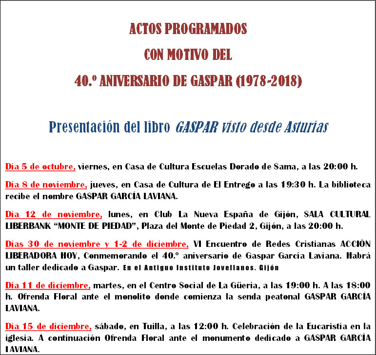 También la presencia de Gaspar García Laviana en el VI Encuentro de Redes Cristianas celebrado en Gijón a principios de diciembre, en el que participó gente de casi toda España. A todo ello hay que añadir lo que con motivo del 40.º aniversario hicieron otros grupos que en Asturias están empeñados en mantener viva la memoria de este distinguido asturiano. Hay que citar muy especialmente el comic GASPAR GARCÍA LAVIANA a tiempo completu, de Ruma Barbero, editado por COSAL y la reedición del libro de poemas Cantos de amor y guerra.