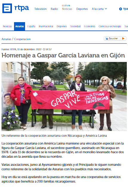 El día 14 de diciembre de 2019 se hace la presentación del libro MI VIDA junto a gaspar garcía laviana cura y comandante sandinista, escrito por Pedro Regalado Díez Olmedo, y con motivo de ambos acontecimientos José María Álvarez Pipo escribe un artículo en La Nueva España, el diario de más difusión de Asturias.