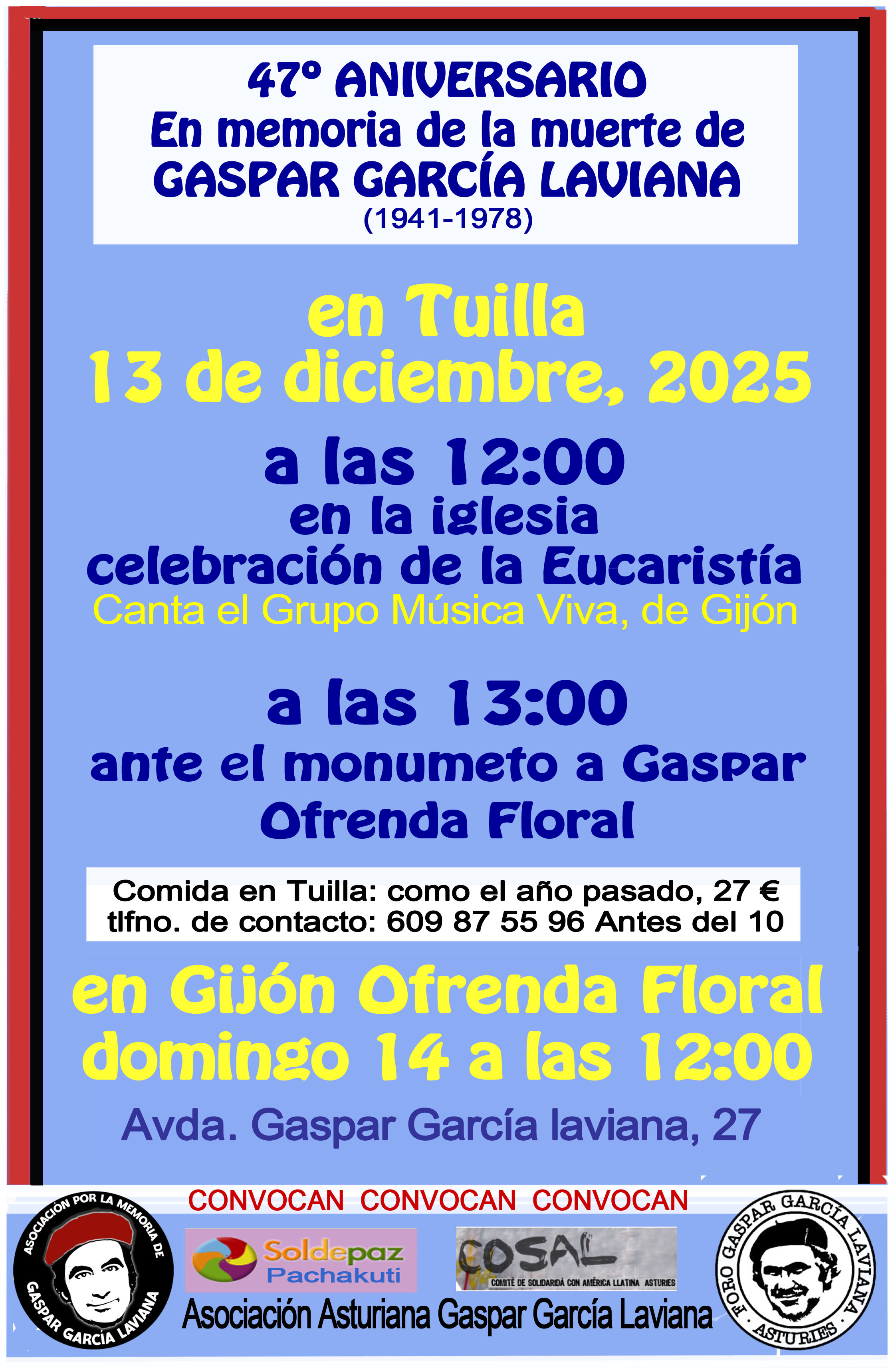 Con la pandemia del COVID-19 nos ha venido también un cierto bajón en lo que se refiere al recuerdo de GASPAR GARCÍA LAVIANA. El año pasado no se ha podido llevar a cabo el encuentro tan importante que cada año venimos haciendo en Tuilla, que siempre tuvo una doble vertiente, igual que la que tuvo la vida del mismo Gaspar: nos juntamos en la iglesia parroquial y a continuación seguía el encuentro ante el monumento que hay muy cerca de ella para hacer en ambos lugares memoria de nuestro querido personaje.