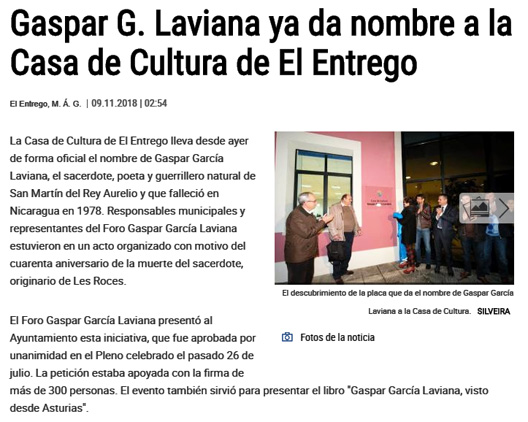 Consideramos también muy importante el hecho de que el Ayuntamiento de San Martín del Rey Aurelio haya dado el pasado 8 de noviembre el nombre de Gaspar García Laviana a la Casa de Cultura de El Entrego, que será siempre un anuncio de la existencia de este personaje nacido en esta parroquia sanmartiniega. Igualmente hay que destacar la Eucaristía y la Ofrenda Floral del 15 de diciembre en Tuilla, actos en los que han participado un importante número de personas.