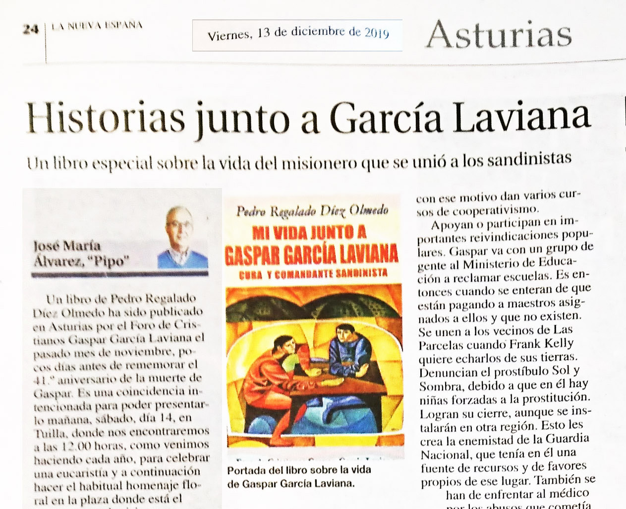 El día 14 de diciembre de 2019 se hace la presentación del libro MI VIDA junto a gaspar garcía laviana cura y comandante sandinista, escrito por Pedro Regalado Díez Olmedo, y con motivo de ambos acontecimientos José María Álvarez Pipo escribe un artículo en La Nueva España, el diario de más difusión de Asturias.